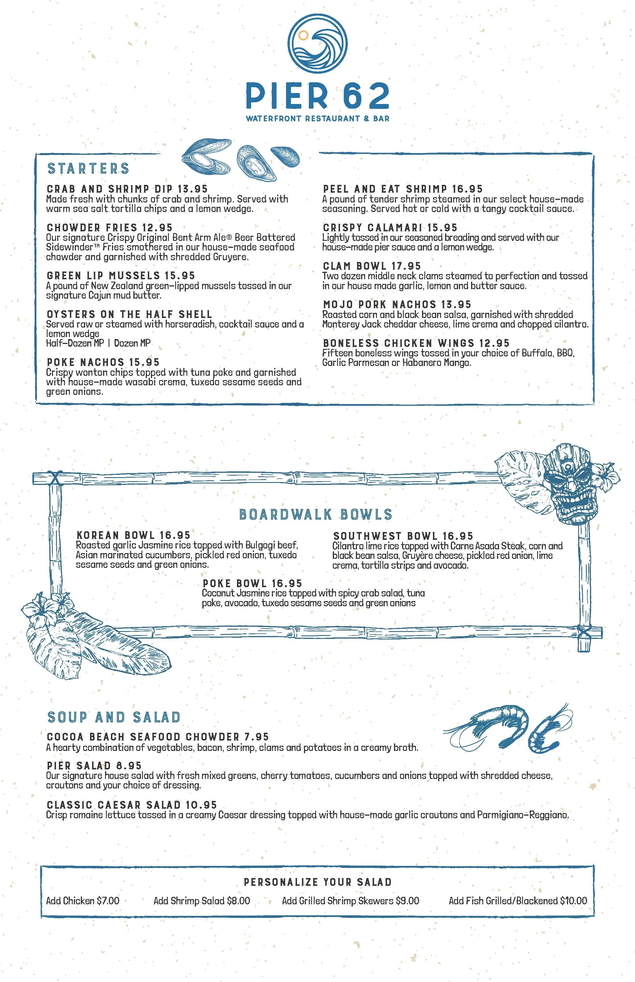 I recently led a full design campaign for Pier 62 Oceanfront Restaurant and Bar in Cocoa Beach, FL—formerly known as Pelican's Bar and Grill. As the sole designer on this rebranding project, I was responsible for developing a new logo, designing the menu, and creating animated promotional materials. The objective was to refresh the restaurant’s identity with a clean, modern look that would resonate with a broader audience. I’m proud to share that the new branding has been well-received and has contributed to an increase in customer engagement.